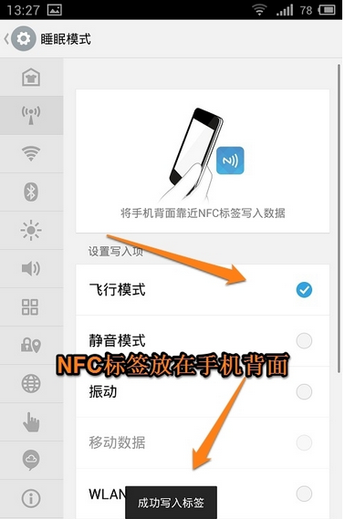 2、比如我們打開睡眠模式,將手機(jī)設(shè)置為飛行模式,如果你有其他的偏好,也可以自行修改添加。設(shè)置好之后,手機(jī)背面掃描一下NFC標(biāo)簽,就會(huì)提示“成功寫入標(biāo)簽”的字樣了。